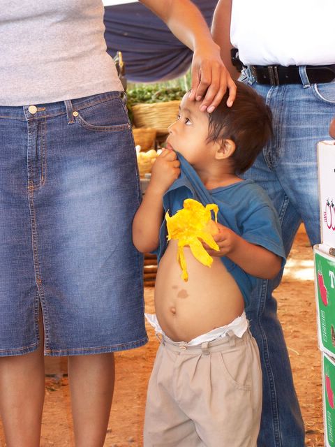 Juan Pablo eating a mango at the fruit and vegetable tianges (market) in Huajuapan.