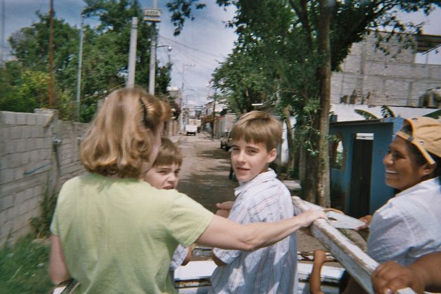 Riding in the back of a truck after buying produce at the fruit and vegetable tianges (market) in Huajuapan.