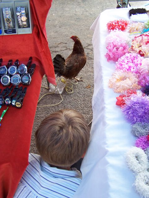 Daniel spots a chicken at the clothing tianges (market) in Huajuapan.