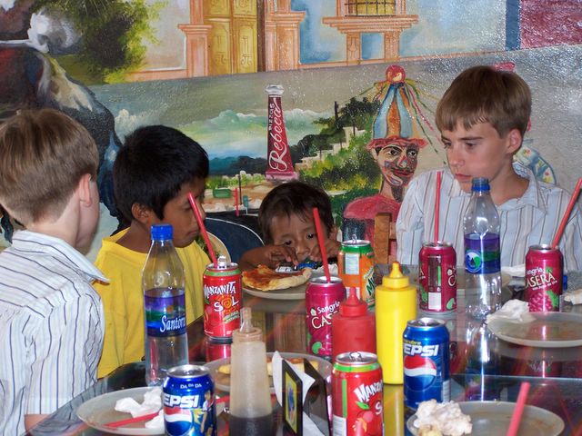 Daniel, Juan Miguel, Juan Pablo, and Brian eating lunch at Pizzas Rebeca in Huajuapan.