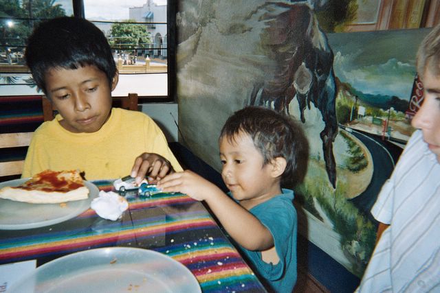 Juan Miguel and Juan Pablo playing with carritos (toy cars) at Pizzas Rebeca in Huajuapan.