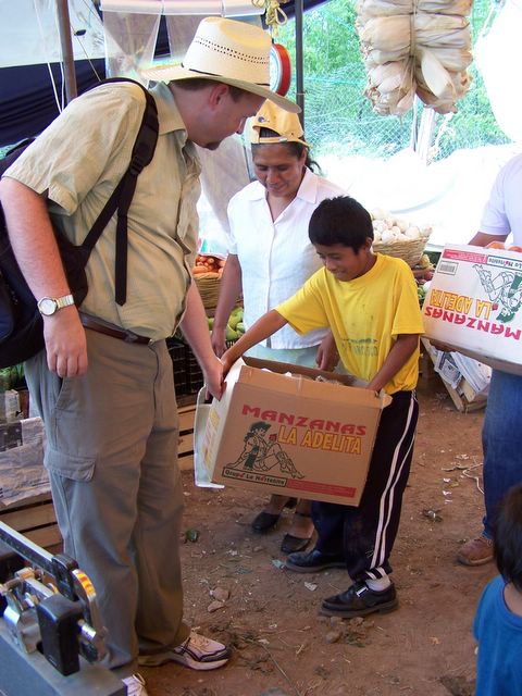 Todd and Juan Miguel carrying a box of fruits and vegetables at the tianges (market) in Huajuapan.