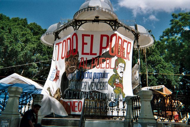 Protester banners at the zocalo in Oaxaca CIty.