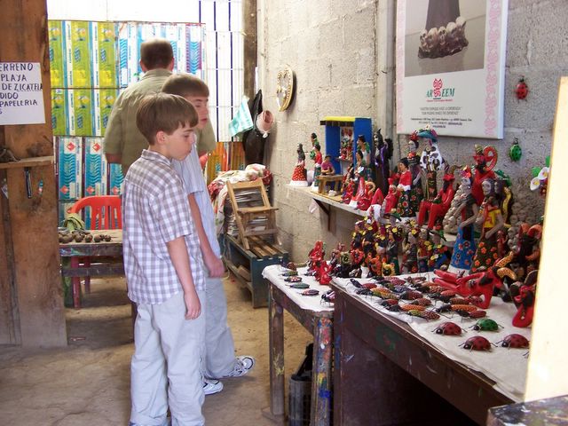 Todd, Brian, and Daniel looking at brightly colored clay figurines at the workshop of the Aguilar sisters in Ocotlán.